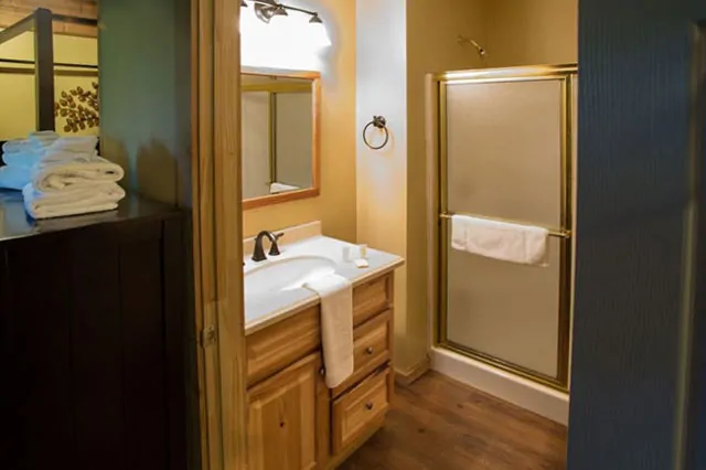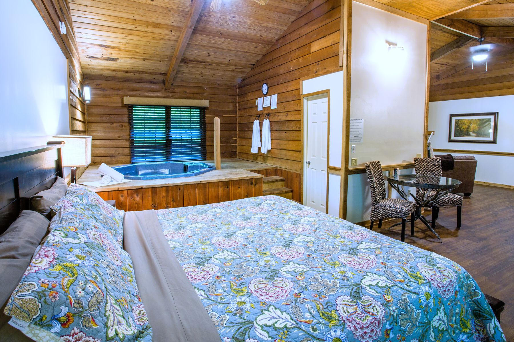 1,400 sq. ft. pet-friendly cabin with 2 king bedrooms, full kitchen, fireplace, private hot tub room, and 2.5 baths. Sleeps families or groups comfortably. Small dogs permitted. Limit 2. Advance notice and pet fees apply.