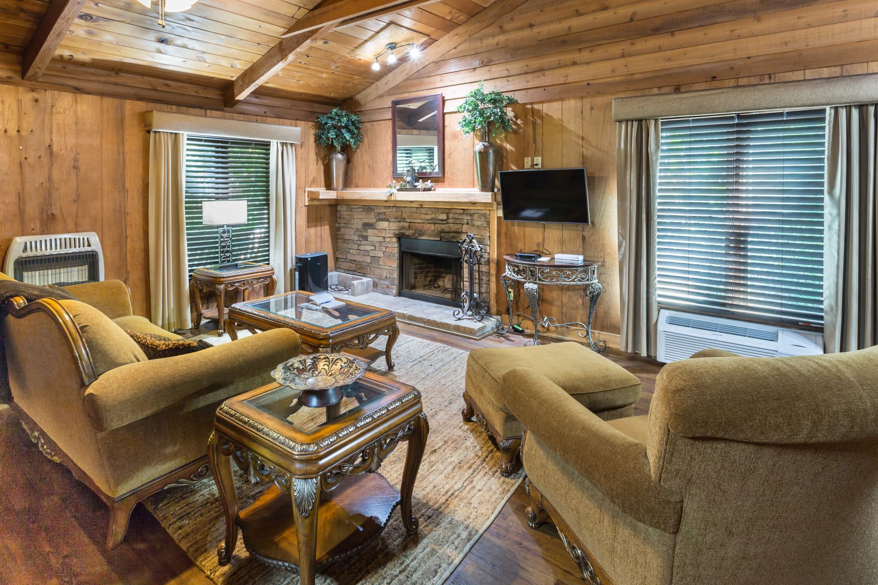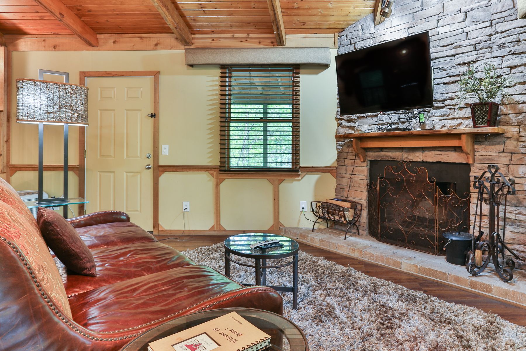 1000 sq. ft. pet-friendly cabin with 2 queen beds, sleeper sofa, hot tub, fireplace, kitchenette, and covered porch. Small dogs welcome (limit 2). Advance notice and pet fees apply.