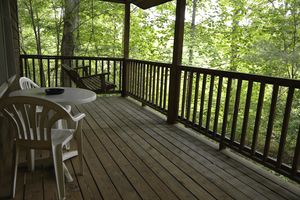 1000 sq. ft. pet-friendly cabin with 2 queen beds, sleeper sofa, hot tub, fireplace, kitchenette, and covered porch. Small dogs welcome (limit 2). Advance notice and pet fees apply.