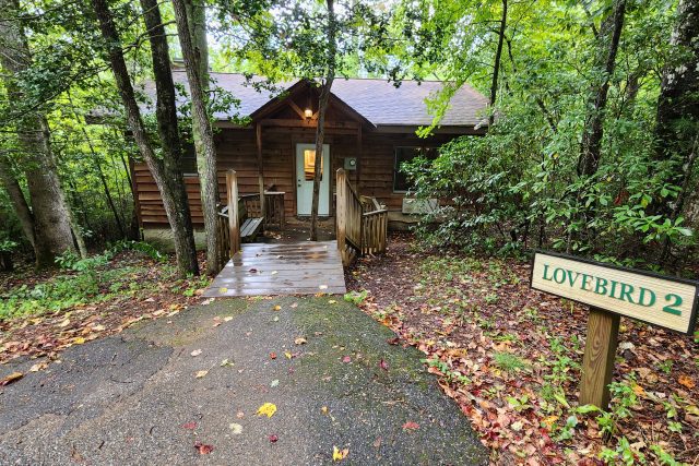 800 sq. ft. cabin with hot tub, wood-burning fireplace, king bed, kitchenette, and covered porch—ideal for a cozy, upgraded mountain escape. NOPETS