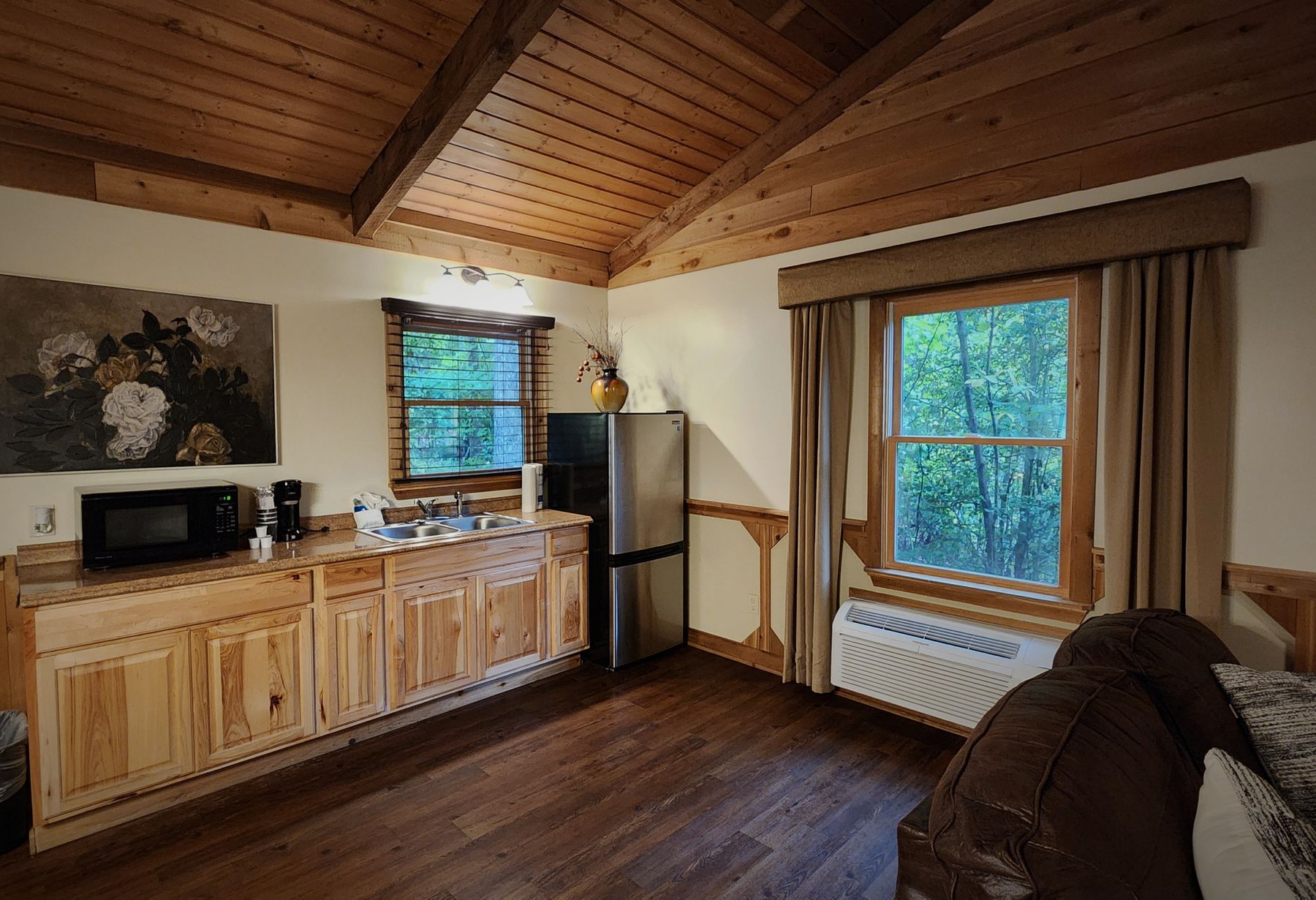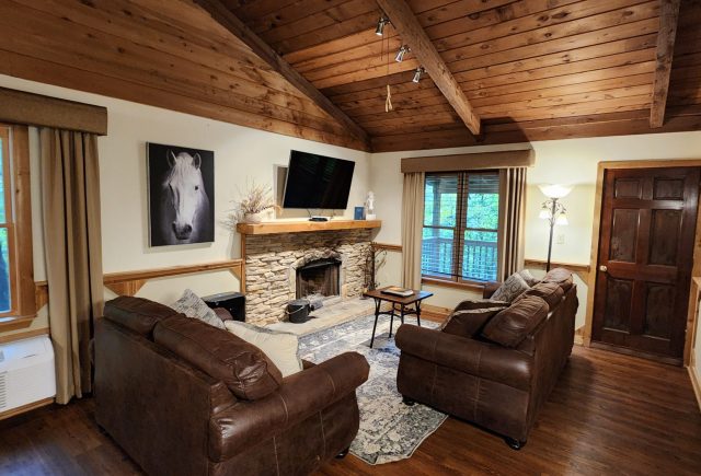1000 sq. ft. pet-friendly cabin with 2 queen beds, sleeper sofa, hot tub, fireplace, kitchenette, and covered porch. Small dogs welcome (limit 2). Advance notice and pet fees apply.