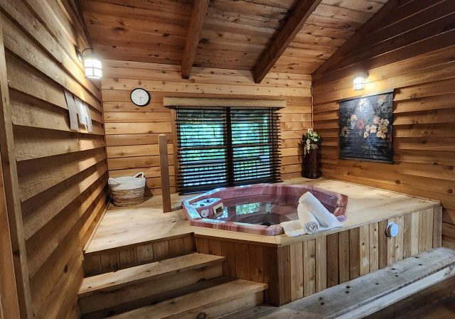 A romantic, private retreat featuring a canopy bed, cozy fireplace, in-room hot tub, and peaceful woodland views—perfect for honeymoons and intimate getaways. NO PETS