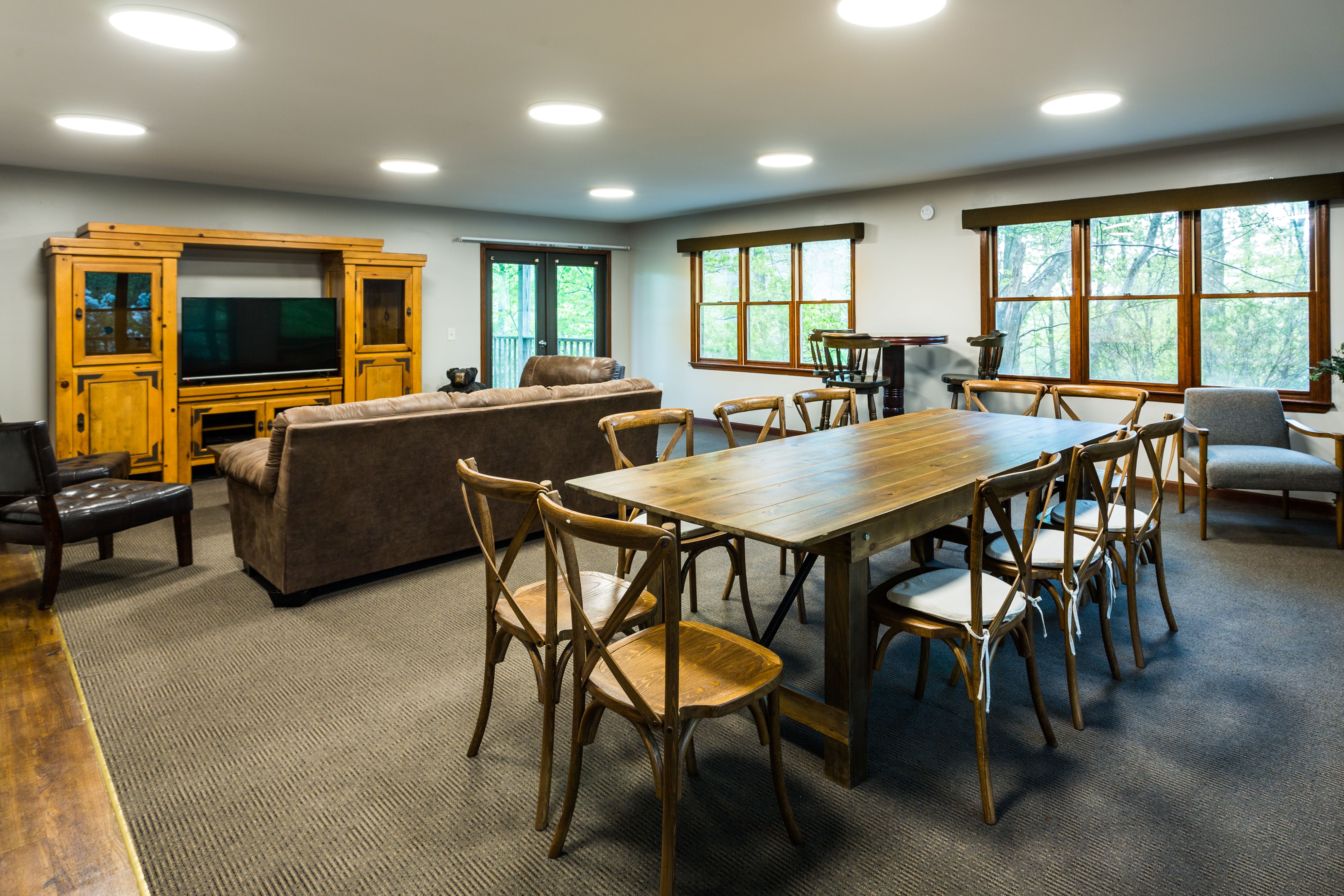 12-bedroom 8-bath lodge with full kitchen, hospitality suite & fireplace—ideal for reunions and group stays with 8 king beds, 8 queen beds & 6 sleeper sofas. NO PETS