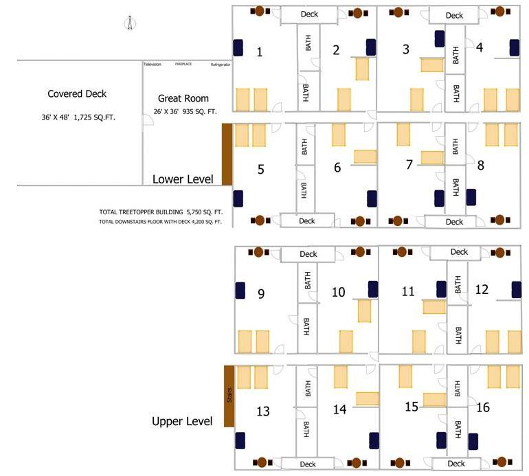 Ideal for large group retreats, reunions, or corporate events, Tree Topper Lodge features 16 private bedrooms and 16 bathrooms, offering privacy and comfort for every guest. Renovated in 2021, this spacious lodge includes a hospitality suite with fireplace and kitchenette, a large covered deck with seating for 24, and convenient access to an outdoor hot tub. Each room is equipped with a TV, HBO, Showtime, WiFi, full bath, and balcony. Sleeping arrangements include 24 king beds, 16 twin beds, and 8 day beds across 16 rooms—half with two kings, half with 2 twins plus a king. The adjacent conference center completes the setup for seamless group experiences in the North Georgia mountains. NO PETS