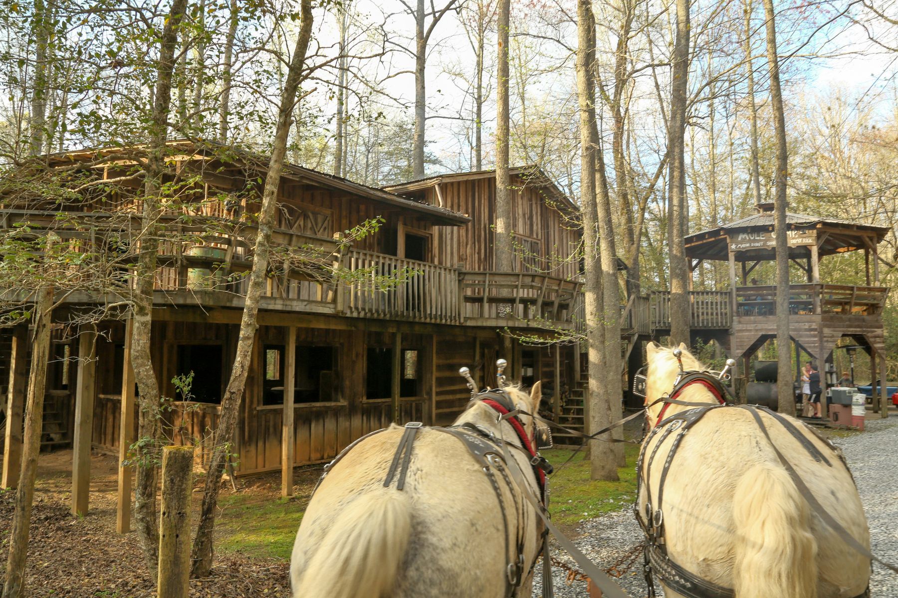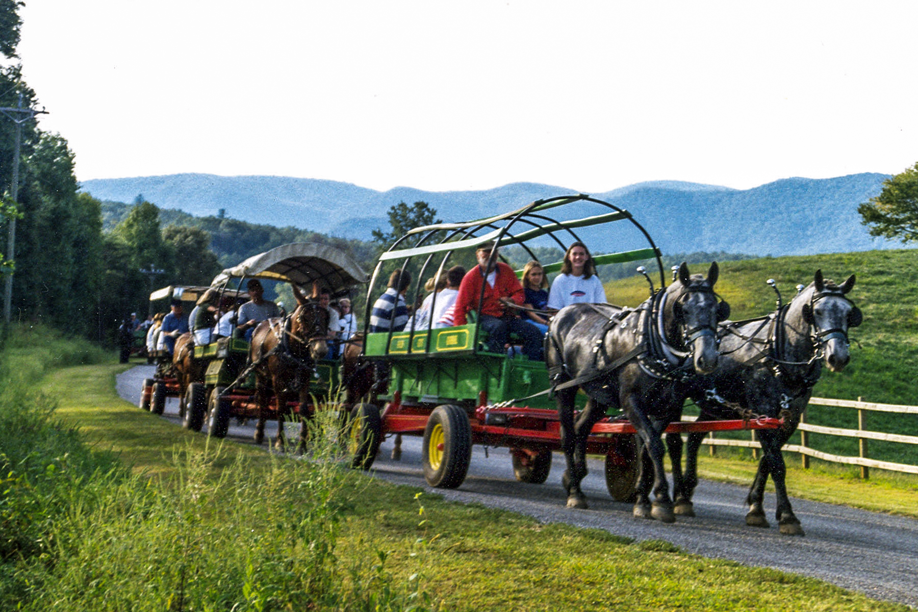 Gold City Corral has 2 wagons plus 1 tractor-pulled trolley. Larger groups may require multiple trips or alternate transportation.