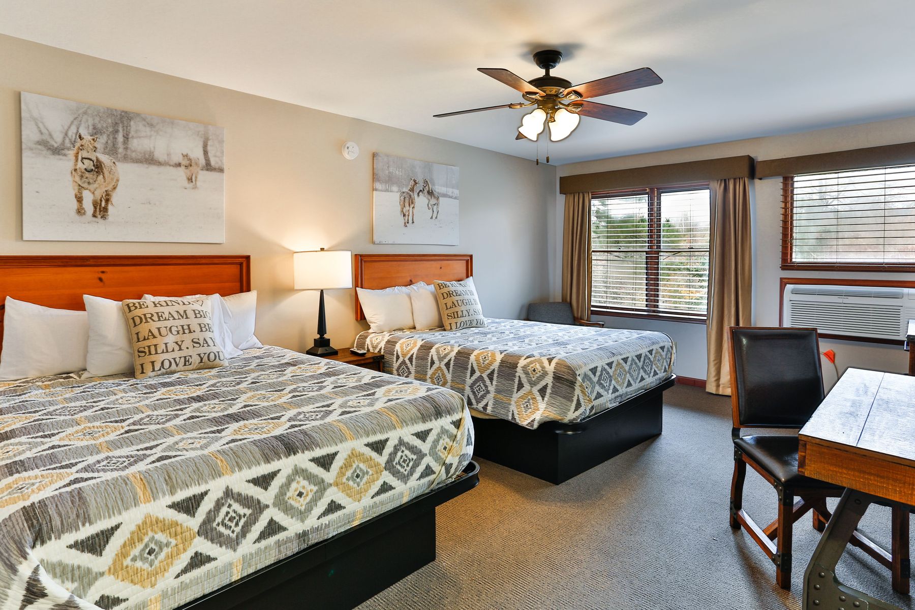This hotel room in our Bear's Den Lodge has 2 queen beds, mini fridge, and TV with HBO and Showtime.