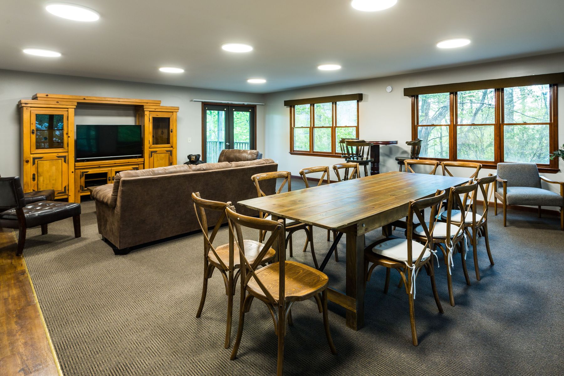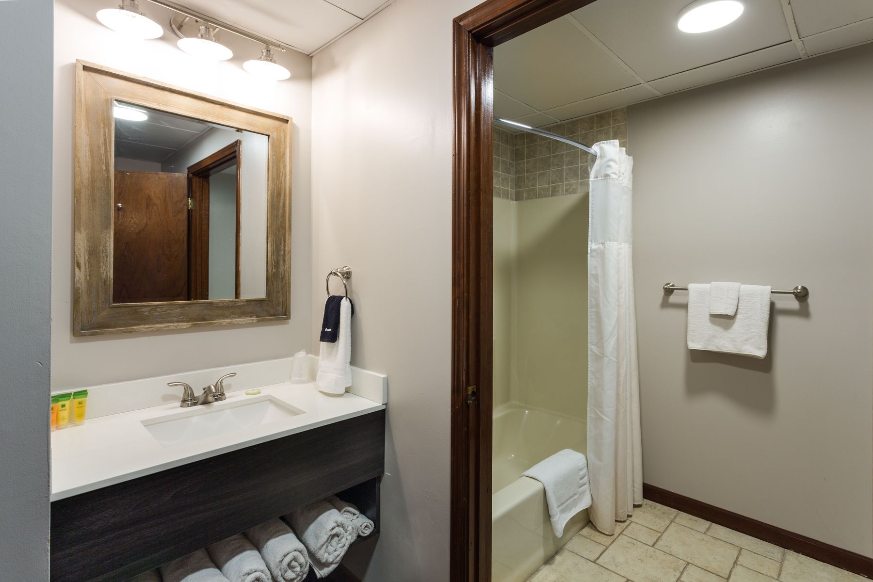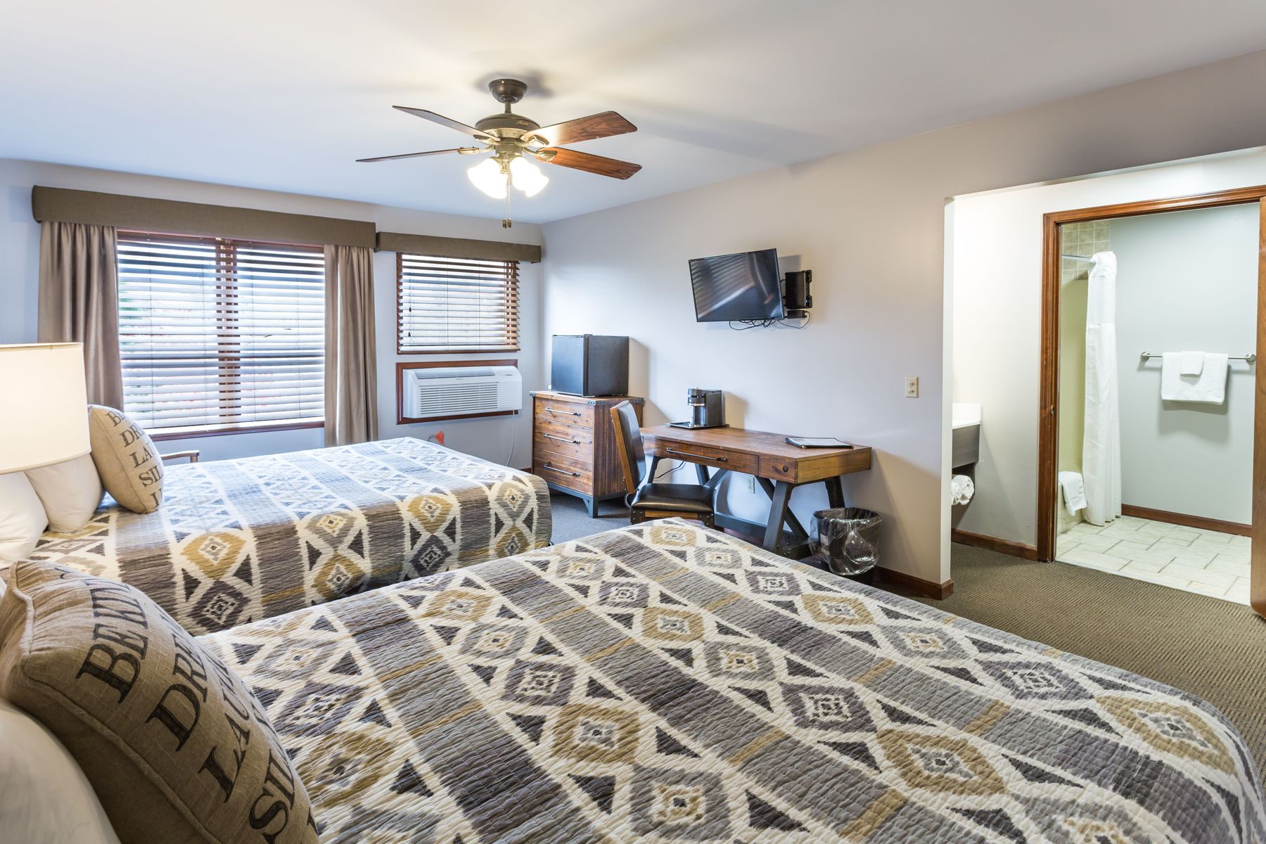 This hotel room in our Bear's Den Lodge has 2 queen beds, mini fridge, and TV with HBO and Showtime.