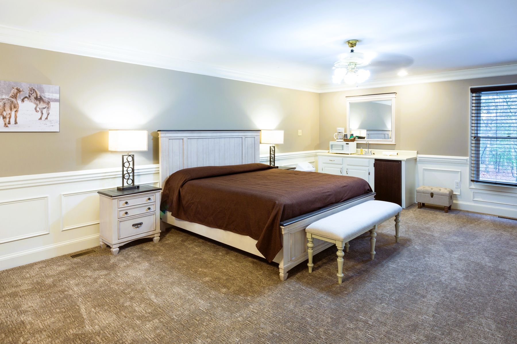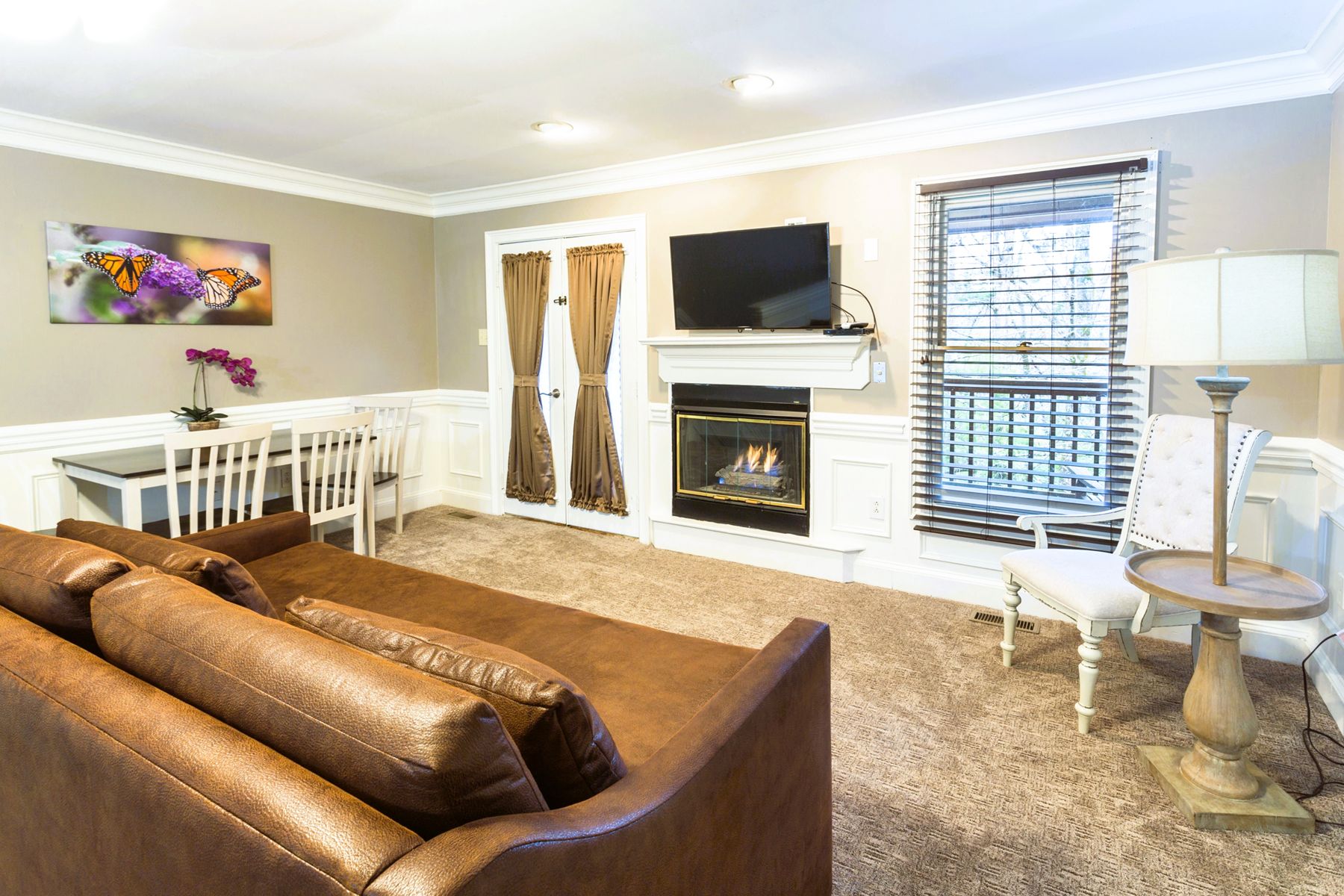 Renovated King suites with fireplace, private bath, kitchenette, balcony, and modern amenities—ideal for a cozy mountain escape. NO PETS
